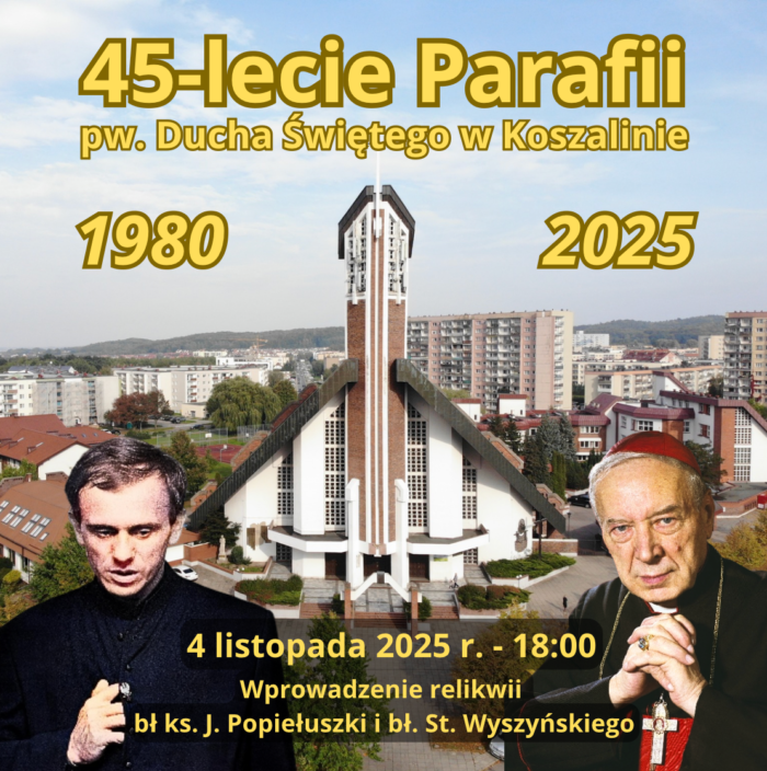 3. We wtorek, 4 listopada, będziemy przeżywali 45-rocznicę powstania naszej Parafii. Z tej okazji Biskup Krzysztof Zadarko odprawi o 18:00 Eucharystię dziękczynną oraz wprowadzi do naszej świątyni relikwie bł. Kardynała Stefana Wyszyńskiego oraz bł. ks. Jerzego Popiełuszki. Trwamy na nowennie za wstawiennictwem tych świętych, przygotowującej nas do tej uroczystości. Odprawiamy ją dziś i jutro po Mszy o 17:00, a w poniedziałek po Mszy o 18:00.